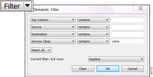 Click the Demands tab to show the Demands table. Notice that this network contains only six demands, all from the er1.lon edge node in the LON site to the edge notes in other sites. |