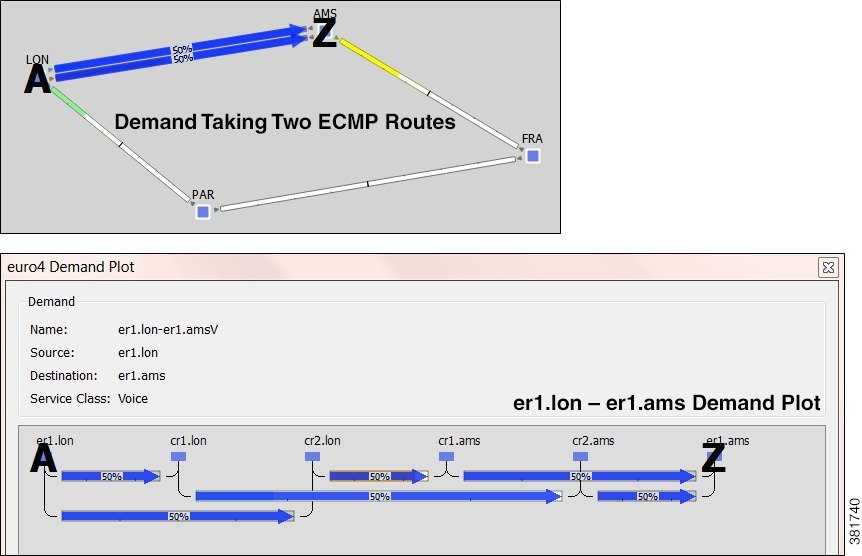 Use the up and down arrow keys to move from row to row in the Demands table, highlighting each demand and showing its routing in the network. Notice the er1.lon to er1.ams demand takes two equal-cost multipath (ECMP) routes along two parallel circuits. Two blue lines show 50% of the traffic flowing through each of these circuits. |