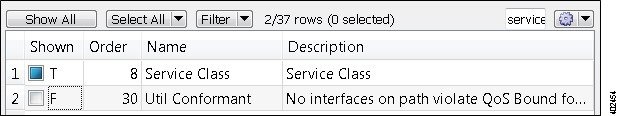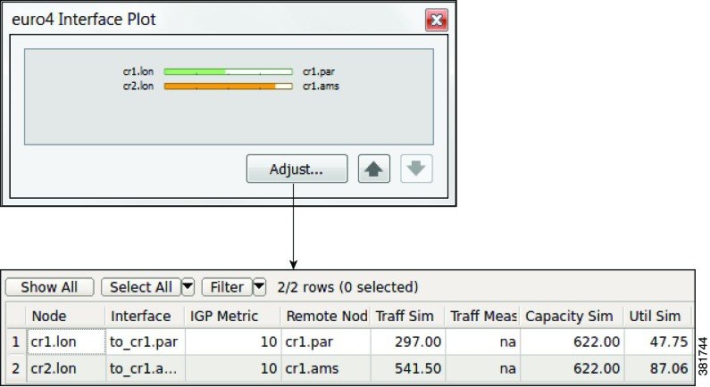 In the network plot, click the green part of the circuit between LON and PAR. Right-click this interface and choose Filter to Selection. The Interfaces table opens and shows only this interface. |