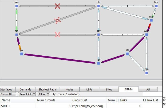 Several WAE Design tools let you simulate SRLG behavior; for example, Simulation Analysis can provide a worst-case analysis of utilizations over SRLG failures. Metric Optimization can optimize routing over failure scenarios that include SRLGs.