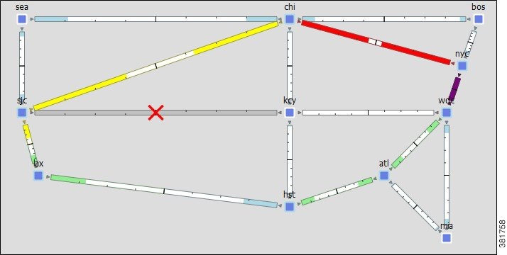 Right-click the wdc-nyc circuit and choose Fail. The red cross on the circuit indicates a failure. Notice the difference in traffic utilization colors in the plot. For example, the kcy-wdc circuit is now congested. |