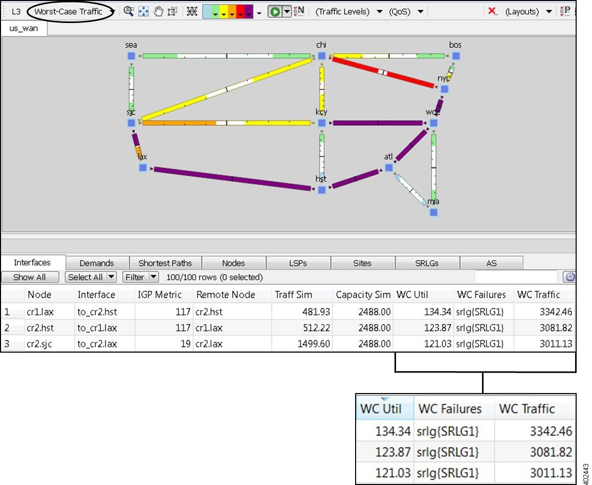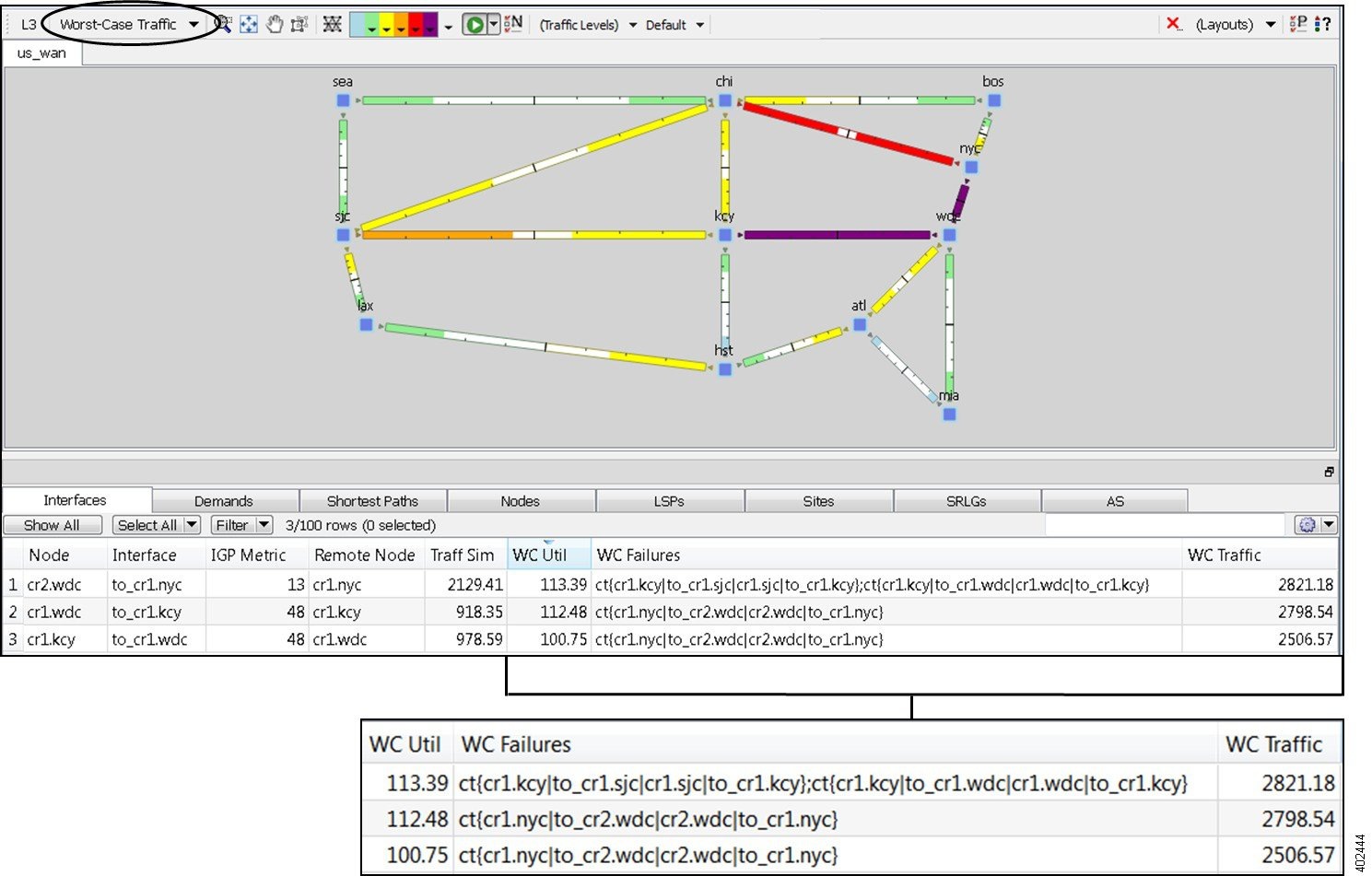 In the Worst-Case Traffic view the interfaces are colored based on their worst-case utilizations over all the scenarios specified for the simulation analysis. This view is useful to see which circuits would become congested under different failure scenarios, and to discover the cause of their worst-case loading on a circuit-by-circuit basis.