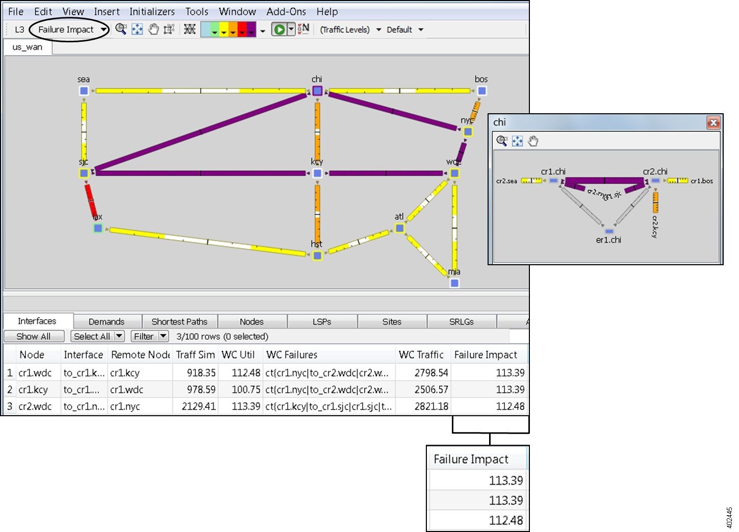 One of the most useful features of WAE Design is its ability to show network behavior when objects fail. For example, your network might show utilizations are well under 100% under normal operation. But what happens under failure?