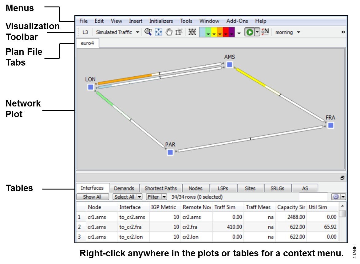 To view the network topology and perform WAE Design operations, you must open a plan file. To use WAE Design effectively, it is helpful to understand the main GUI components.