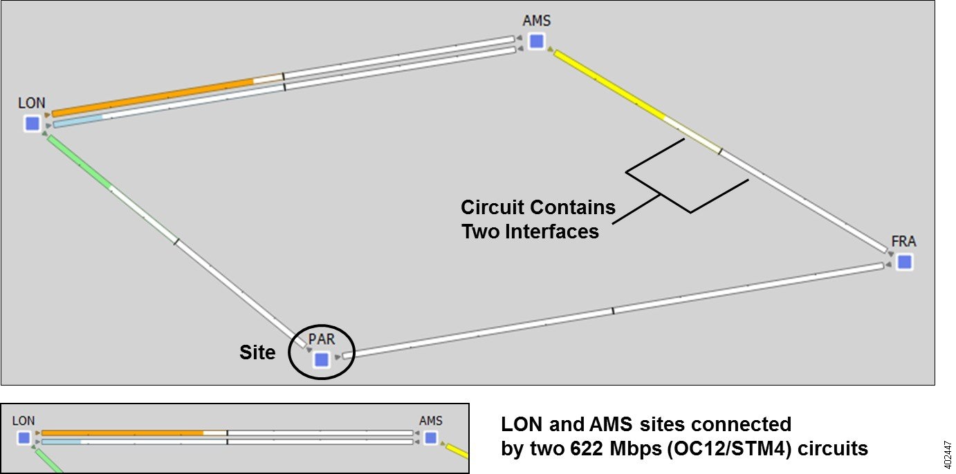 Double-click the LON site to open its site plot. Notice that some circuits show at the minimum width with no fill color; this is because these circuits do not have a specified capacity. |