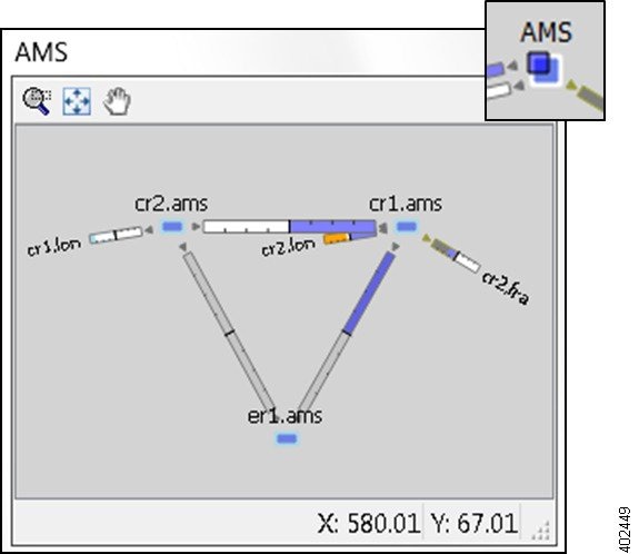 Click the purple drop-down arrow in the Utilization Color menu to see that the maximum utilization value is 100%. Choose Max. This resets the maximum threshold percentage to the most highly utilized interface, which color fills that interface, cr2.lon-cr1.ams, to purple. ![]() |
