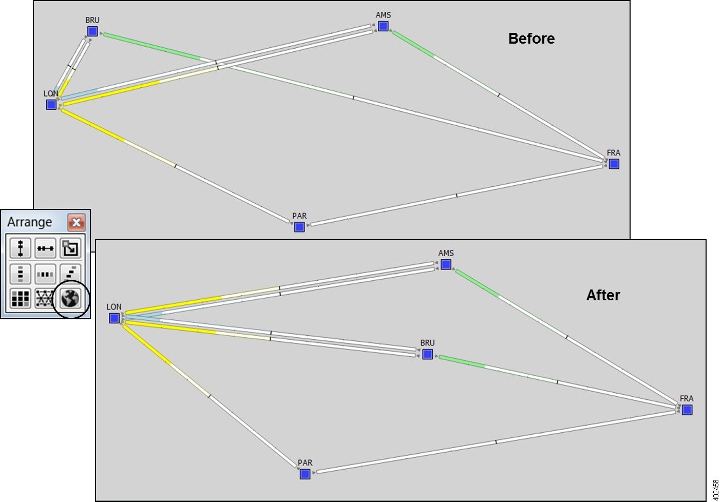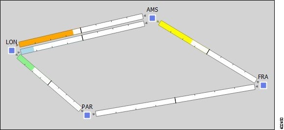 Read the values in the Traffic column and note they have increased by 50% to 94.5, 133.5, and 213 Mbps. The plot shows that modifying this traffic created severe congestion between LON and AMS as noted by the purple color fill. Compare, for example, the color of interfaces between LON and AMS to those prior to the simulated traffic increase. ![]() |