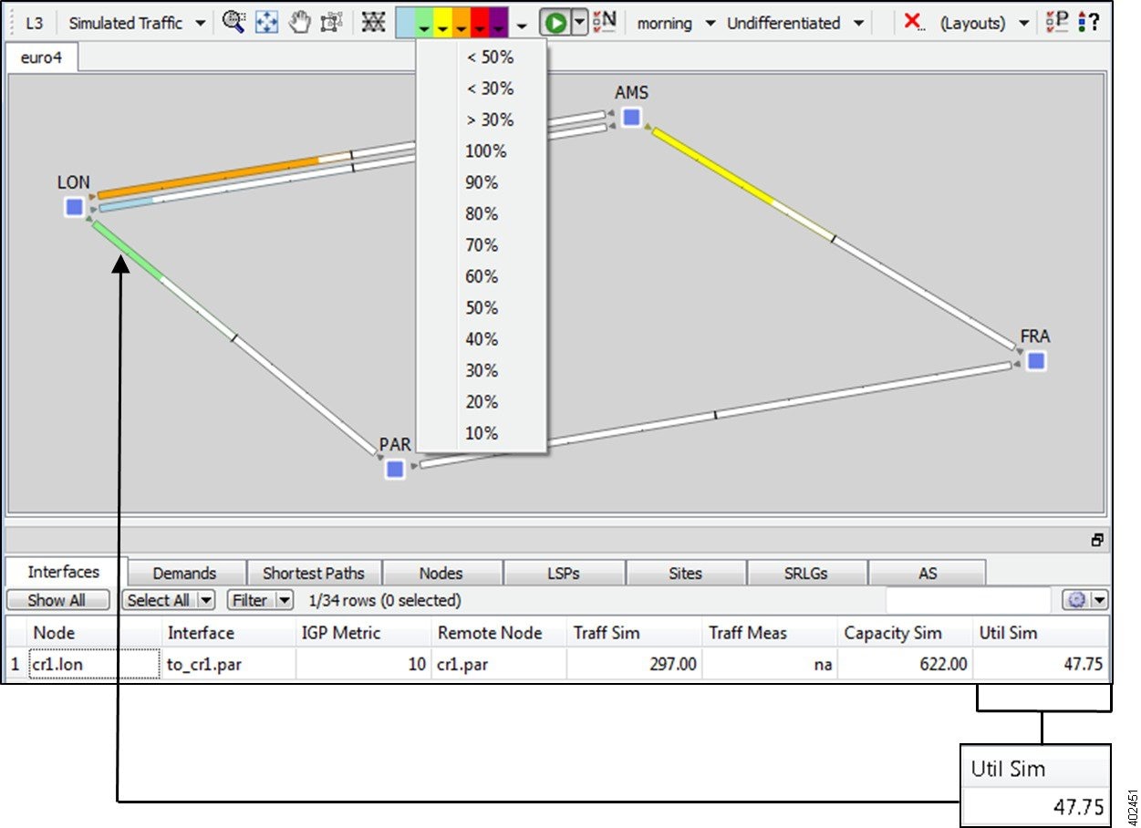 Notice all traffic utilization is under 100%. You can tell this because none of the interfaces are purple, which by default means over 100% utilized. Also, the Util Sim column in the Interfaces table shows no values over 100. |
