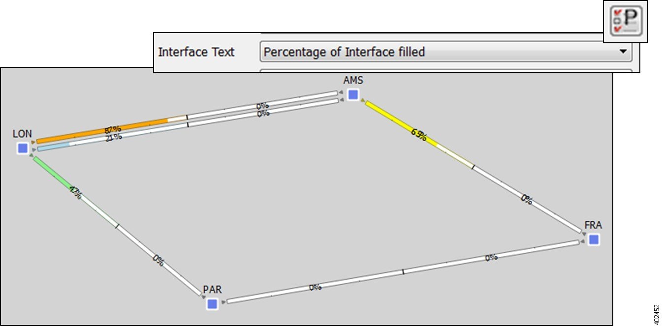 WAE Design shows either measured network traffic or simulated traffic, depending on the view. The color fill of an interface shows the bandwidth utilization for traffic leaving that interface in proportion to the interface capacity. That is, it shows the traffic utilization.