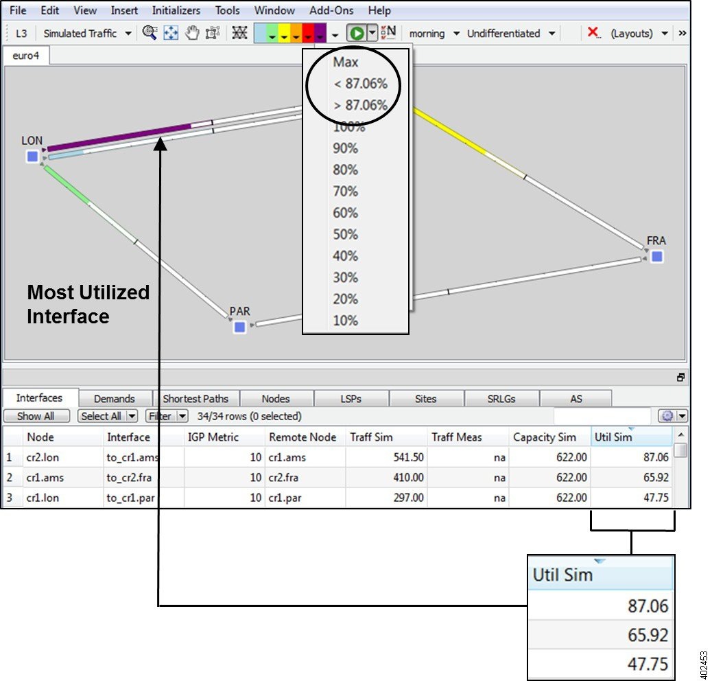 Click the purple drop-down arrow again to see that maximum is now 87.06%. Verify this by reading its Util Sim value in the Interfaces table, which is also 87.06%. |