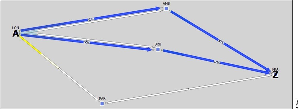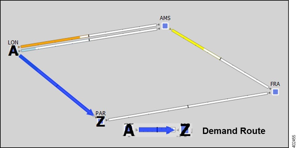 In the Demands table, click the demand from er1.lon to er1.par. The network plot shows this demand from LON to PAR sites using a blue arrow to show the route, an A to show the source, and a Z to show the destination. ![]() |