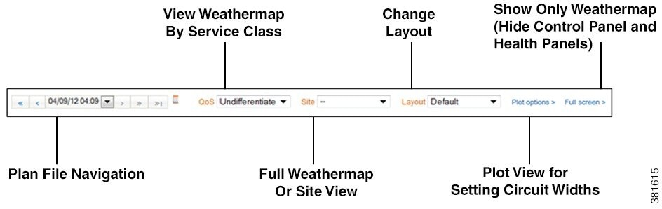 Note these colors are configurable in the WAE Design GUI where the administrator creates the template for the WAE Live plan files. The utilization legend at the bottom of the weathermap identifies the template’s utilization colors and their values.