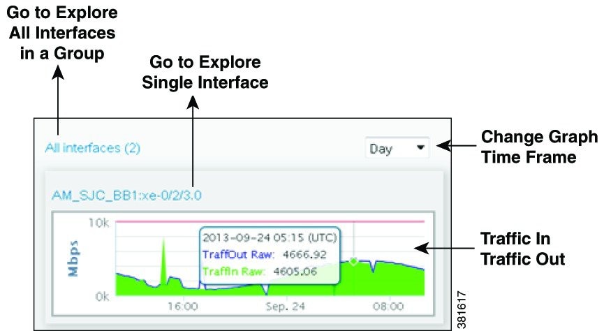 To navigate to graphs for all interfaces connected to that peer, click the icon. Graphs appear for only those interfaces connecting this peer on its associated site. To go to the associated Explore page for these interfaces, click the All Interfaces link at the top of the graphs.