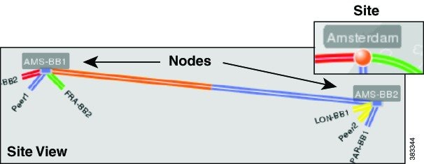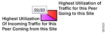The far left column lists the peers, while each top column lists the associated sites. The icons represent the traffic flowing between the two. While the color gives you a visual indication of traffic, hovering the mouse over each icon lists the numeric values.