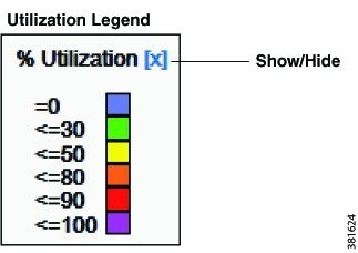 Default utilization colors depends on how your administrator set up the visualization of the plan file. This visualization might be either in a Design or Weathermap color scheme. Default colors are blue, green, yellow, orange, red, and purple (Design) or magenta (Weathermap), and sequentially each of these colors represents increased utilization.