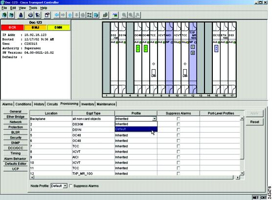 If you want to suppress alarms at the card level for ports, double-click the card and then in the card view, click the Provisioning > Alarm Behavior tabs.