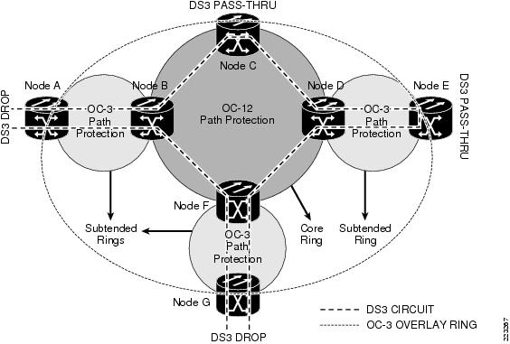 A typical path protected overlay ring configuration is shown in Figure 12-36, where the circuit traverses the nodes B, D, and F twice resulting in two cross-connections on these nodes for the same circuit. In Figure 12-36, the circuits on the OC-12 path are unprotected. The DS3 drop traffic is protected on the drop nodes by provisioning a primary and secondary destination, making it a path protected circuit.