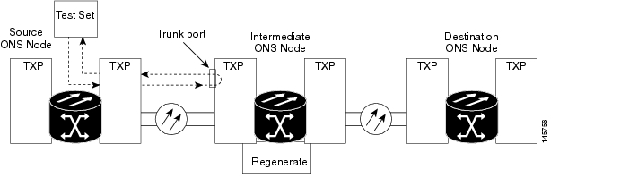 The second is a terminal loopback at the trunk port. In this situation, the test set traffic comes in through the TXP client port, travels through the card, and turns around because of the terminal loopback in effect on the card just before it reaches the LIU of the trunk port. The signal is then sent back through the card to the client port and back to the test set.
