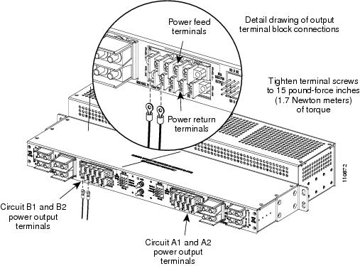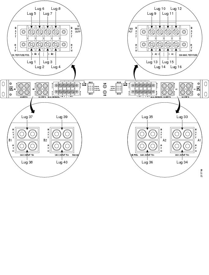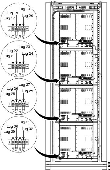 Cisco ONS 15454-FAP-LVD Operations Guide for more information. Figure 31 through Figure 35 show output and input lugs and wiring and Table 1 lists lug wiring positions.![]()