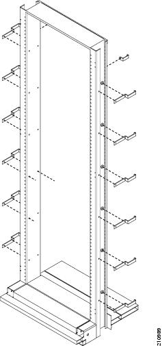 To attach a single tie-down bar, align the ends of the tie-down bar with two screw holes located in the vertical rack frame. The L-shaped bends with screw holes at the ends of the tie-down bar should point outward away from the bays.