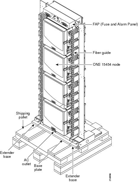 The ONS 15454 four-shelf and zero-shelf bay assembly ships in a corrugated container that covers the rack on its shipping pallet. After removing the corrugated container, you must remove the bolts that hold the rack to the pallet before moving the unit to the desired location. Figure 5 shows the four-shelf bay assembly on a shipping pallet.