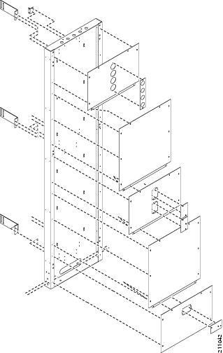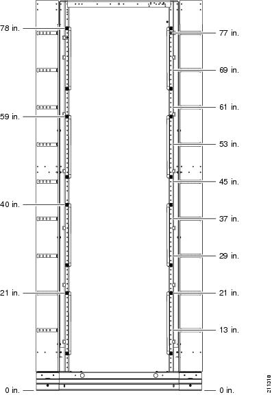 Figure 10 shows the proper location of the tie-down bars and fiber brackets on the rear of the bay assembly rack. Measuring the height in inches from the floor, the locations of the top screw hole on each tie-down bar are shown on the left side of the figure. The attachment points for the fiber brackets are shown on the right side of the figure.
