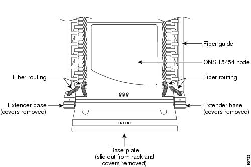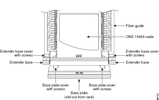 You can use the base plate or extender base holes to route the fibers. Cisco recommends using the base plate holes for the bottom node and the extender base holes for the other three nodes on the four-node rack. All electrical cables will be routed in the back of the rack in the extender bases. Holes should already be cut out in the raised floor tile to compensate for any DS1, DS3, ground and power cables.