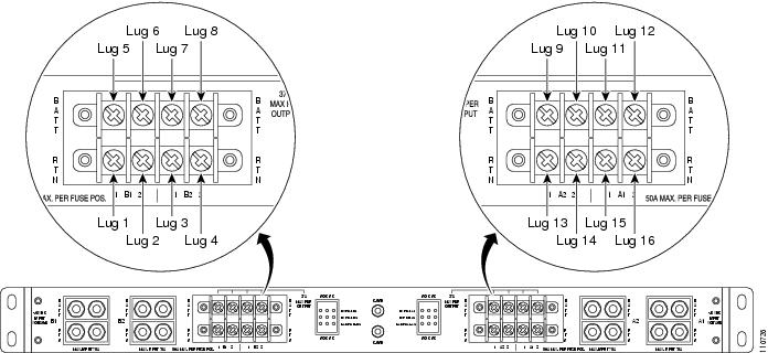 The ground studs and power input and output terminals are mounted on the rear side of the FAP. The plastic protective covers install over the input and output power terminals to prevent accidental contact with the terminals when power is present in the panel.