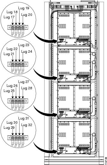 Cisco ONS 15454-FAP-LVD Operations Guide for more information. Figure 26 through Figure 30 show output and input lugs and wiring and Table 2 lists lug wiring positions.Figure 26 Connecting Output Power Using Ring-Type Compression Lugs