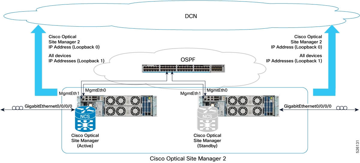 Cisco Optical Site Manager instances are configured in high availability, accessible via OSC from other nodes connected to