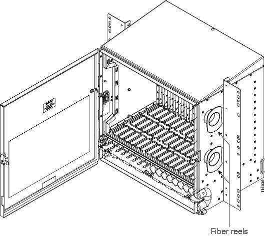 If the ONS 15454 shelf does not already have the appropriate deeper brackets (700-18765-XX and 700-18766-XX) installed, unscrew the mounting screws on the fiber reels and remove the fiber reels (Figure 1). Remove the existing brackets and install the deeper brackets in the same location. See the Cisco ONS 15454 Procedure Guide for more installation information.