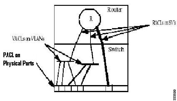 The c7600 has mechanisms to apply Access Control Lists (ACLs) at various levels such as Router, VLAN, and Port level. Router Access Control Lists (RACLs) are applied on a Switch Virtual Interface (SVI) or physical interface to filter out the layer 3 traffic. VLAN Access Control Lists (VACLs) are configured on VLANs, and are applicable on the layer 2 and the layer 3 packets passing through the VLAN.