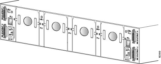 The Cisco external power supply rear panel has two AC power connectors, each with an on/off switch, and four DC connectors for connecting to devices.There is an LED for each module slot. Figure 1-5 shows the rear panel. Refer to "Connecting the Cisco External Power Supply to the Cisco Ethernet Switch Network Modules," for information about required cables and connectors.