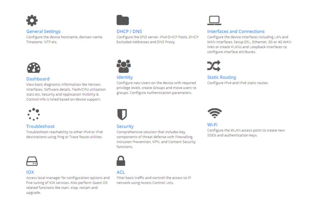 Any further changes to configuration can be done by navigating to the landing page, and choosing the feature of your choice. This is the same page that will be displayed to you once the basic configuration is present on the device: