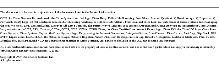 Cisco documentation and additional literature are available in a CD-ROM package, which ships with your product. The Documentation CD-ROM is updated monthly and may be more current than printed documentation. The CD-ROM package is available as a single unit or as an annual subscription.