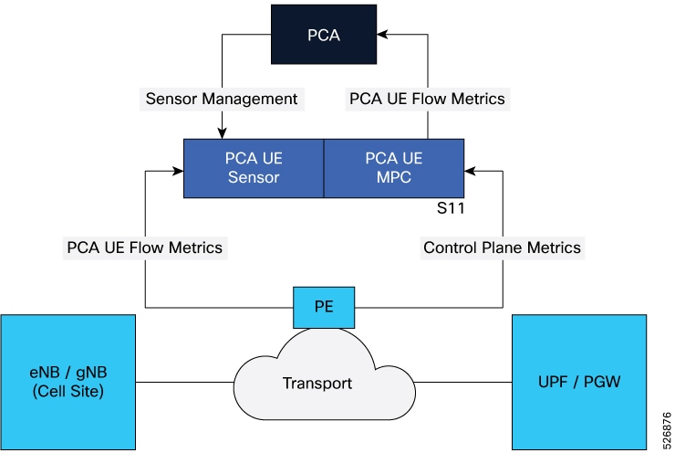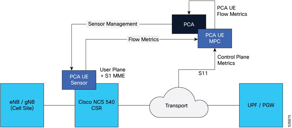 The PCA UE collector collects the user plane and control plane metrics. It then streams combined flow data into the PCA.