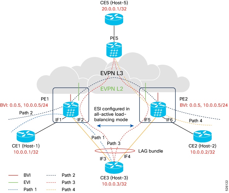 • Path 3: Host-3 communicating with Host-5 using a EVPN single-active multihoming interface