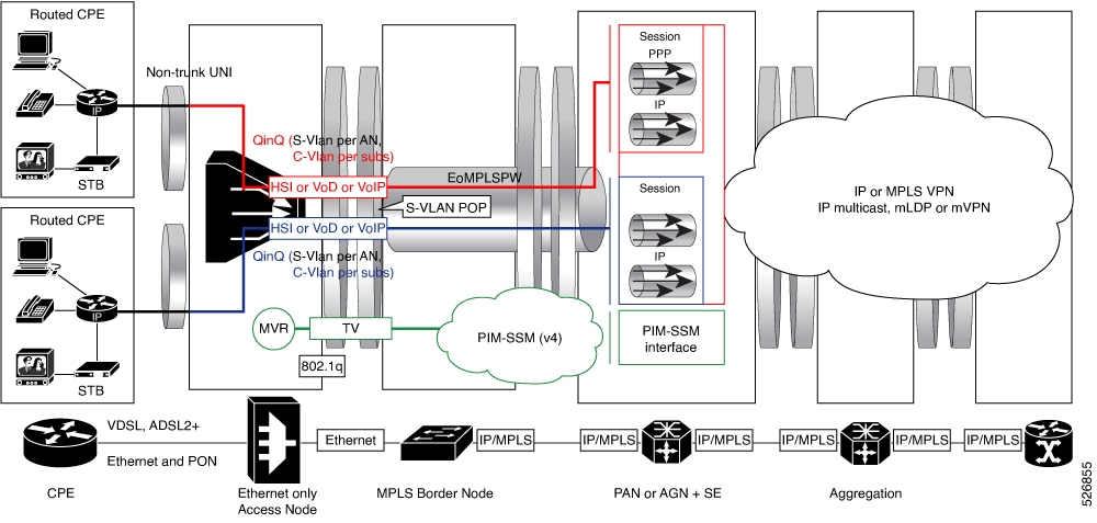 In this model, all services from the access network are enabled on different sub-interfaces on the same pseudowire. The PW is negotiated for VC type 5. This solution model provides up to service level aggregation; an aggregate shaper may not be applied on the main interface.