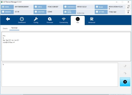 The following image shows the IOx tab which contains 4 management operation buttons and and a text area showing the details