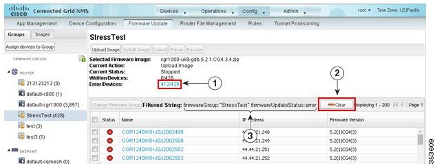 Tip: Click the Error/Devices link (1 in Firmware Update Page – Errored Devices) to apply a filter (3). Click the Clear (2) button to revert to an unfiltered view of the selected device group.