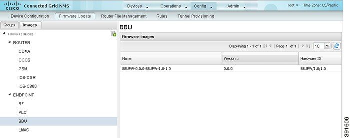 You can display firmware image information from the Images pane in the Config > Firmware Update page. Select ROUTER or ENDPOINT to display all firmware images for those devices in the IoT FND database. Select the firmware image type to refine the display. For example, Config > Firmware Update Images Pane shows that selecting ENDPOINT > BBU displays the available BBU firmware image file name and version, and supported Hardware ID.