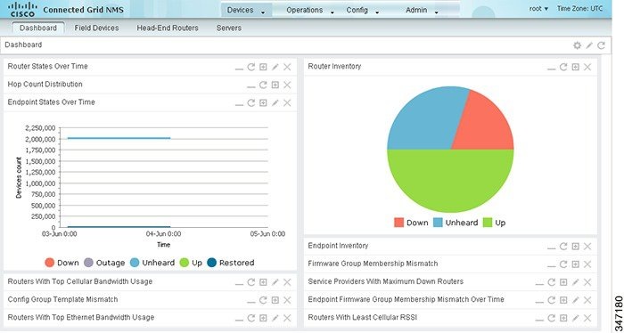The IoT FND Dashboard (IoT FND Dashboard) displays dashlets to provide a visual overview of important network metrics.