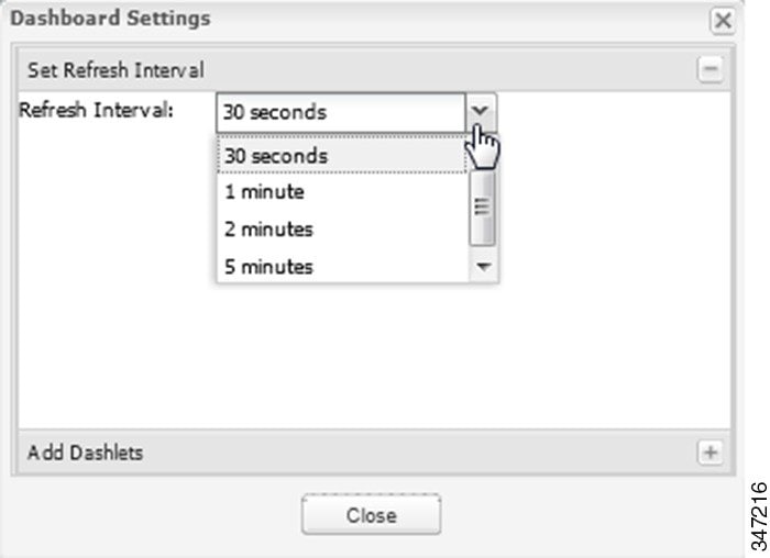 Click the Settings button in the title bar to set the refresh interval for all charts and add dashlets back to the Dashboard.