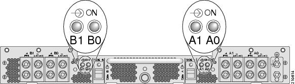 As viewed from the front (PLIM) side of the chassis, the left two power supplies feed output A, while the right two power supplies feed output B.