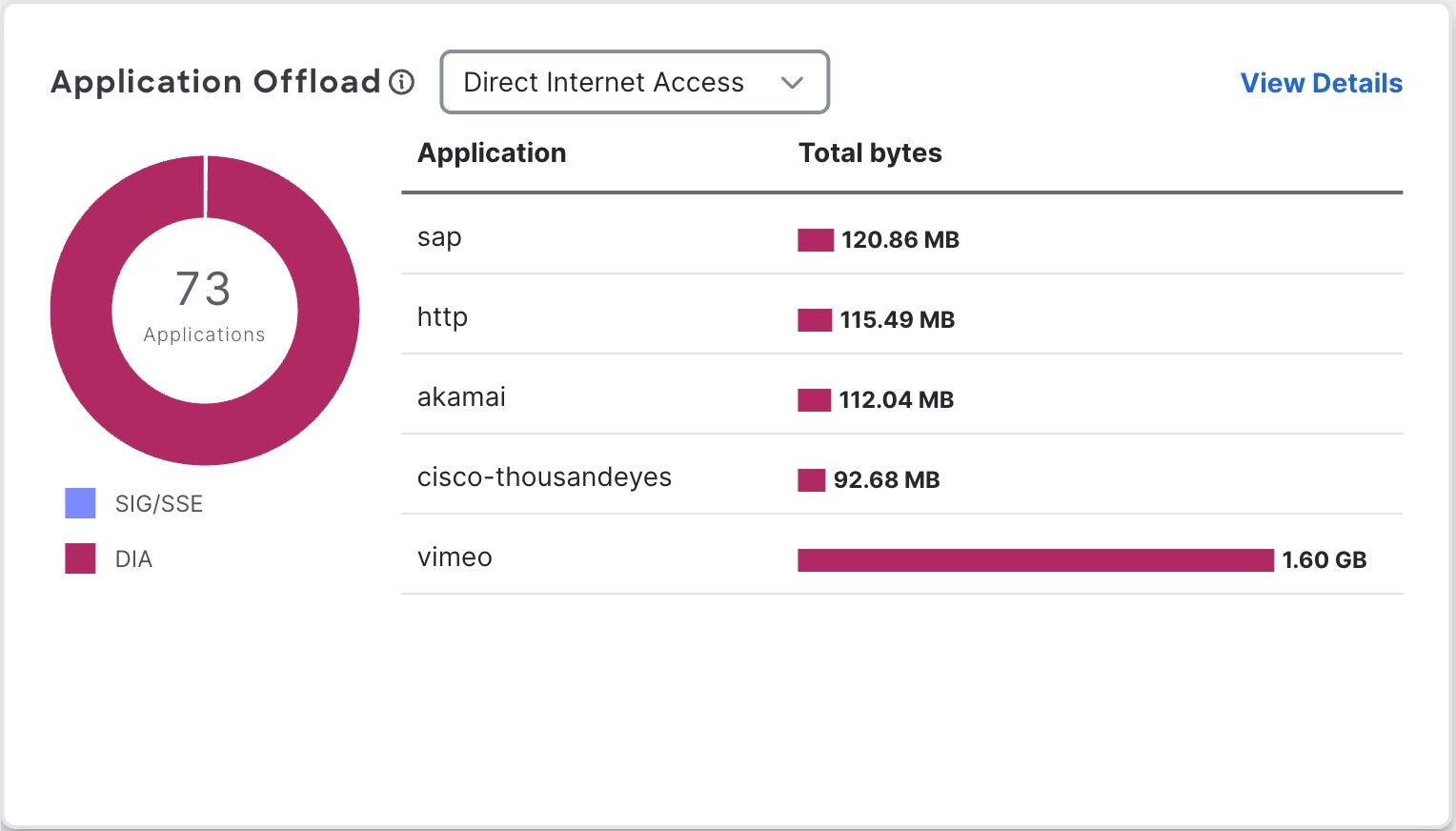 A new Application Offload dashlet is introduced that displays the breakdown of application traffic across SIG or Secure Service Edge (SSE) tunnels
