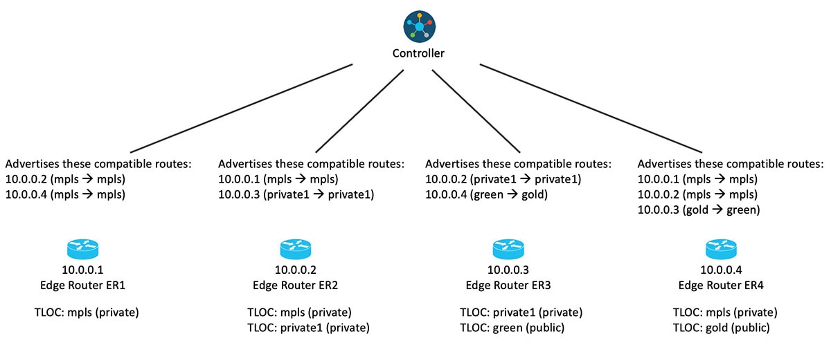 For example, if a router only has TLOCs with private colours, Cisco SD-WAN Controllers do not advertise public routes to the device. Similarly, if a router only has TLOCs with public colors, Cisco SD-WAN Controllers do not advertise private routes to the device.