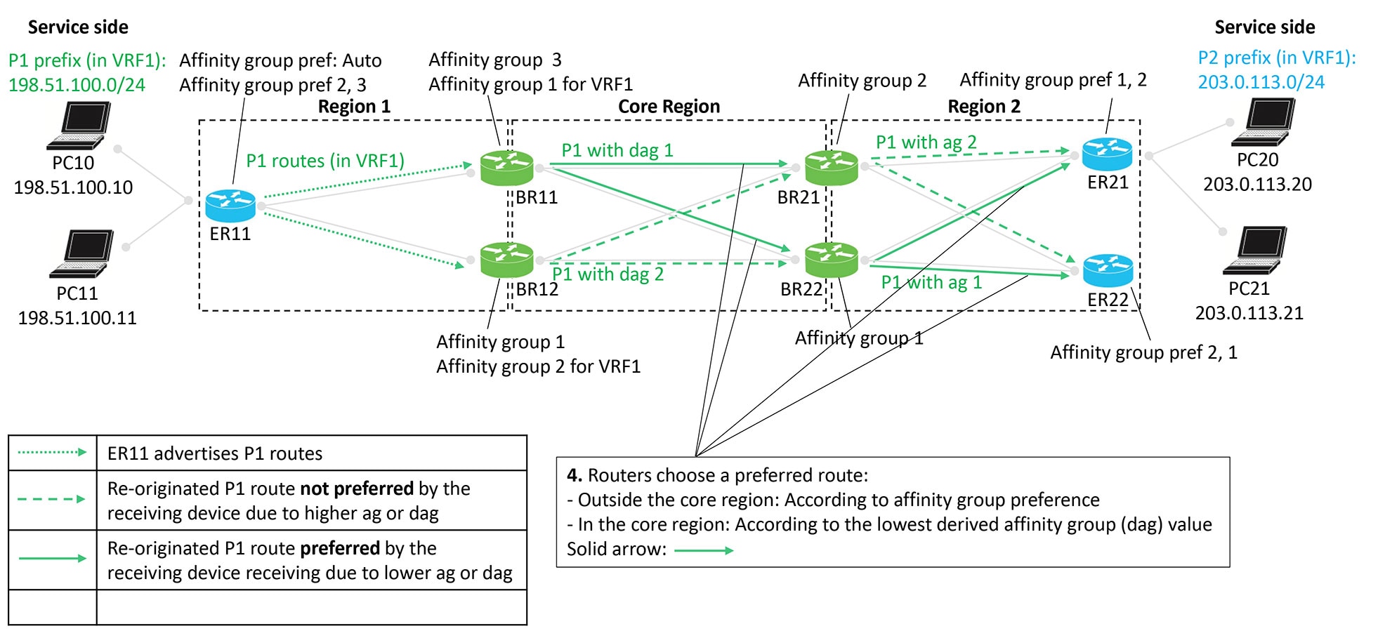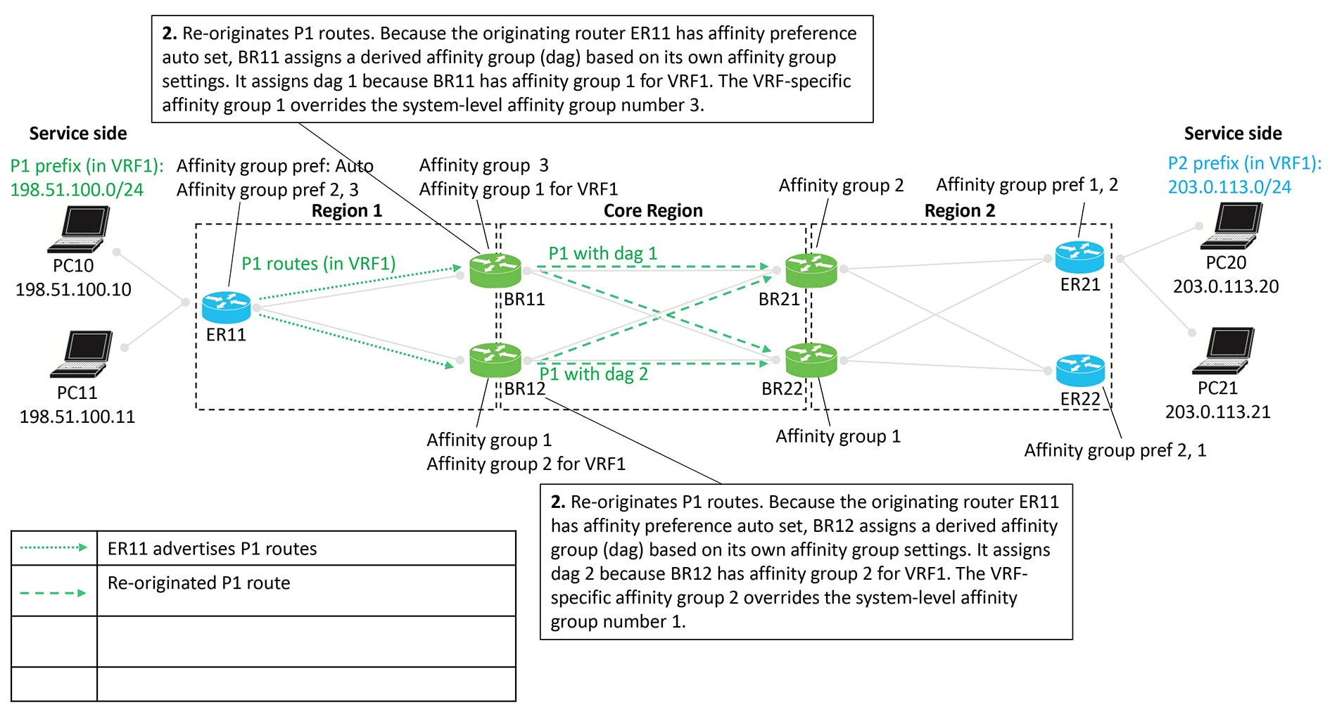 Edge router ER11 advertises P1 routes. These routes are re-originated as they move from Region 1 toward Region 2, passing through border routers that assign affinity groups and derived affinity groups (DAG).