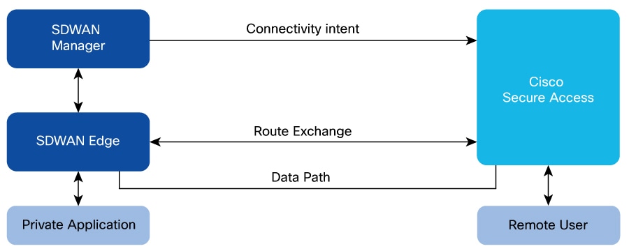 Private application access using Cisco SD-WAN Manager is a secure connection that enables remote Cisco IOS XE Catalyst SD-WAN devices and Cisco secure routers to access private applications through Cisco Secure Access.