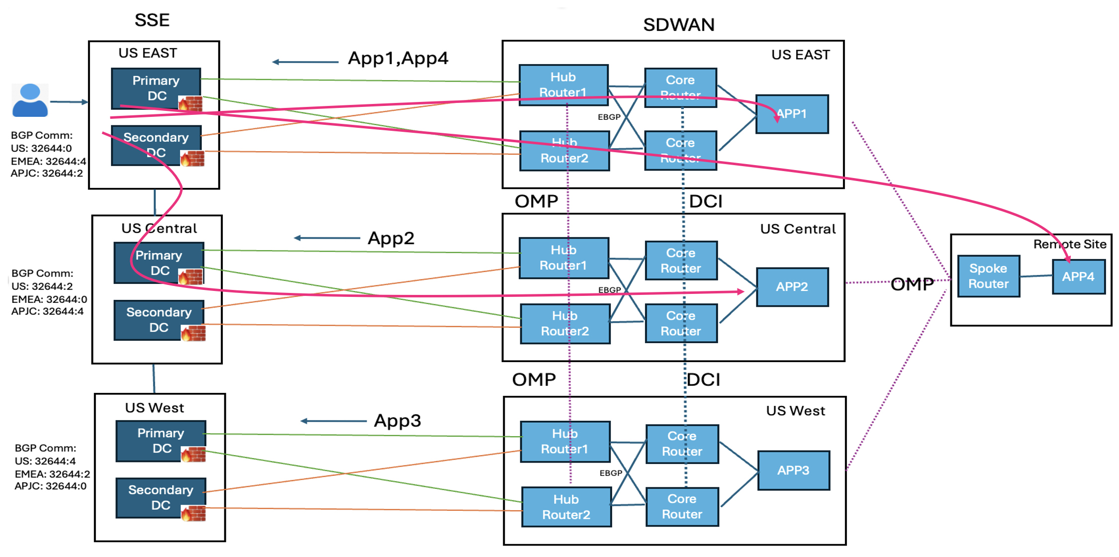 Remote users terminating in SSE US region can access applications in any SD-WAN region. All traffic, both incoming and outgoing,