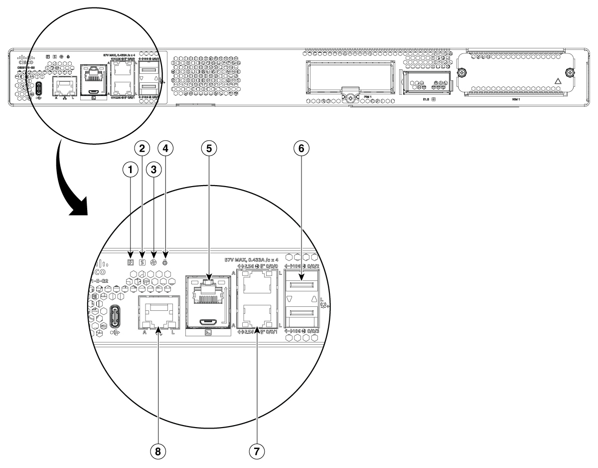 Left LED: Integrated RJ45 Console or AUX port function enabled Off: USB console mode Green on: Console enabled |